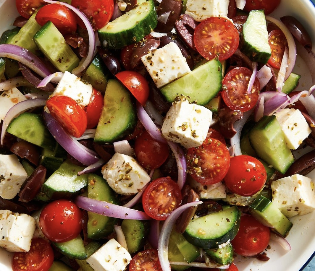 Tomatoes, cucumber, red onion, feta cheese, and black olives, seasoned with salt and oregano, and dressed with olive oil.